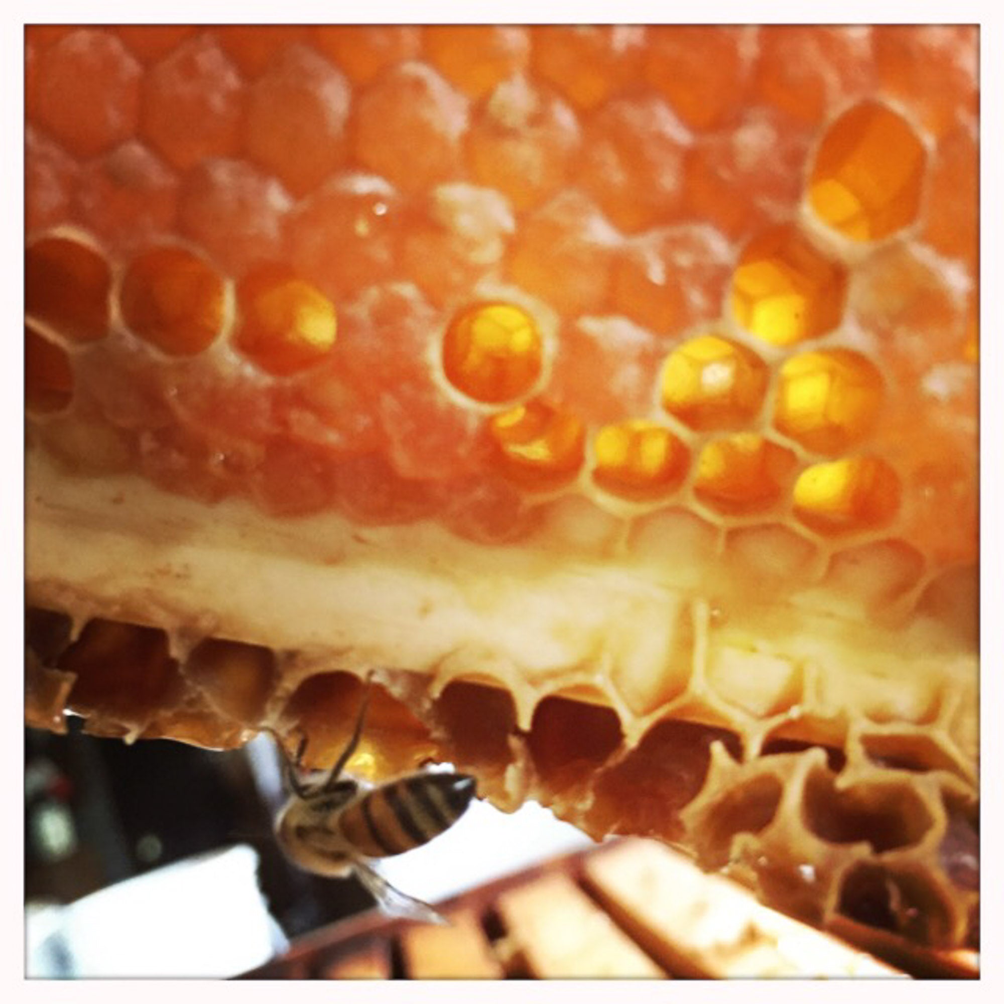There is a common misconception that raw honey is hard or crystallized. Honey is a warm liquid in the hive as you can see in this picture. Over time raw honey will crystallize but you can bring it back to its original liquid form by gently heating it