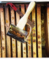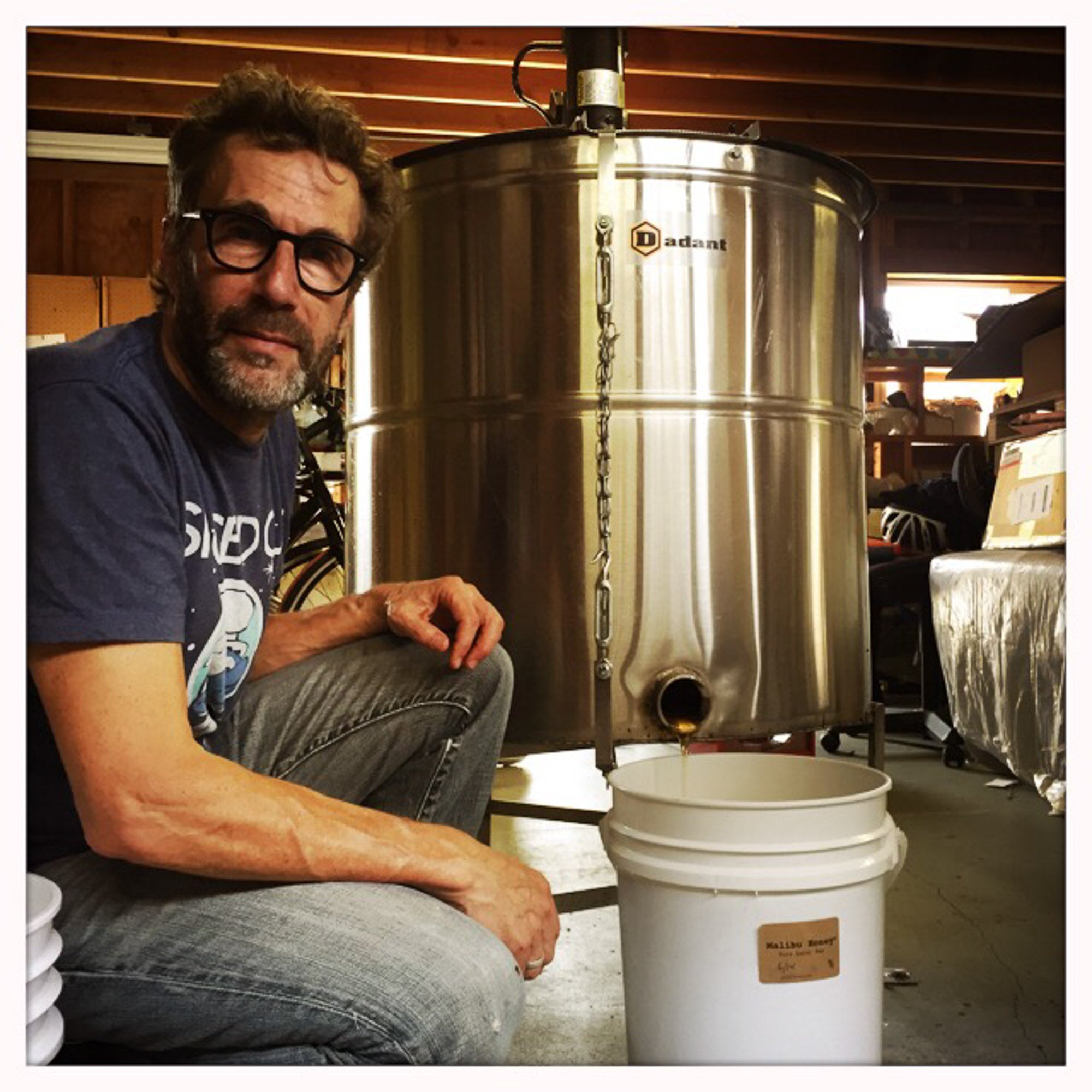 Bruce Lampcov the owner of Malibu Honey is using a radial extractor to get the honey out of the comb. This way much of the original comb remains intact and the bees don't have to start from scratch to rebuild the comb. This saves bee energy and they make more honey.